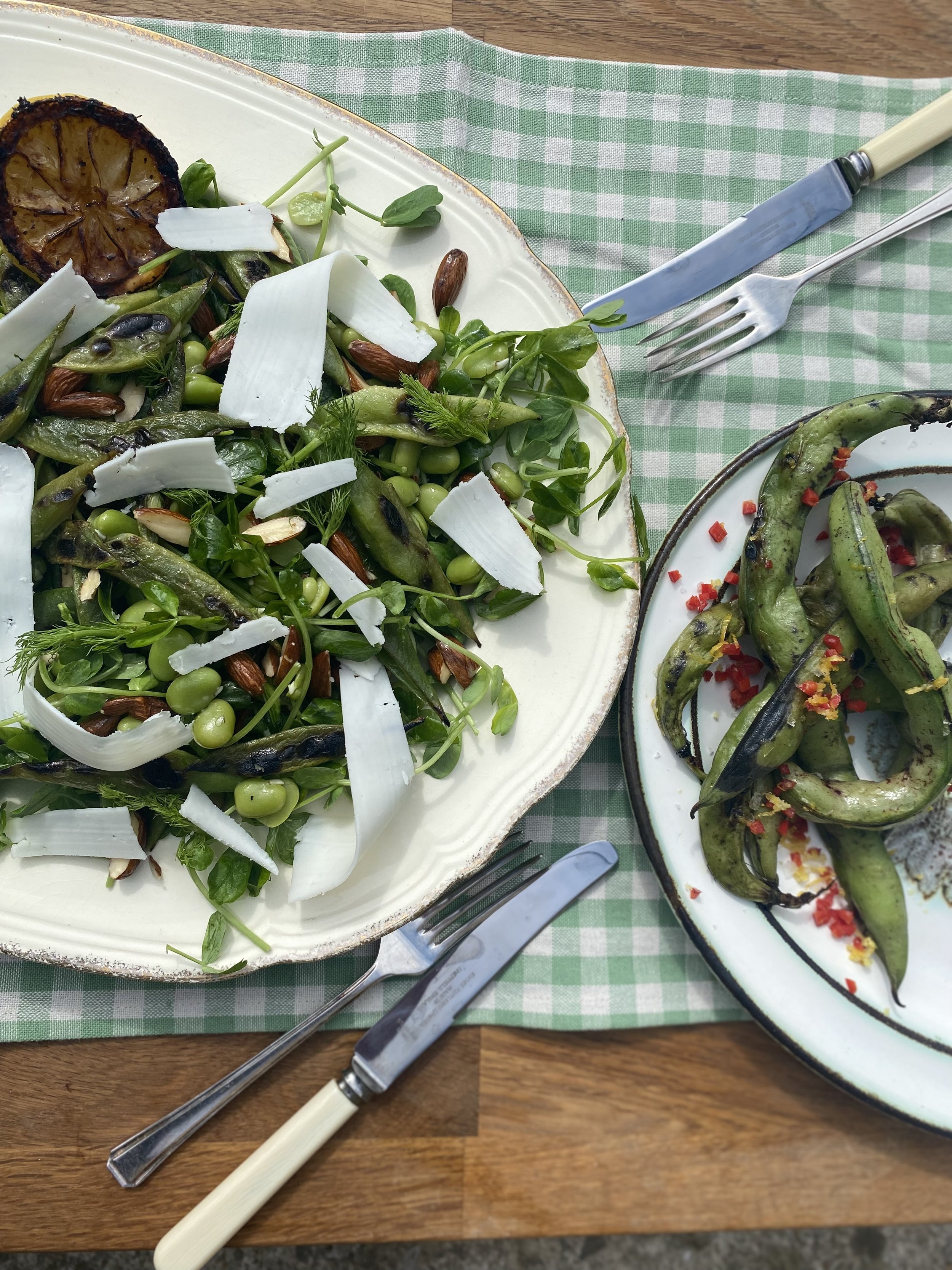 This is the perfect recipe for making the most out of the vibrant and full of flavour early summer peas, beans and hedgerow goodies. I’ve paired these glorious greens with a wonderful aged goats cheese from sustainable Somerset cheesemaker White Lake Cheese