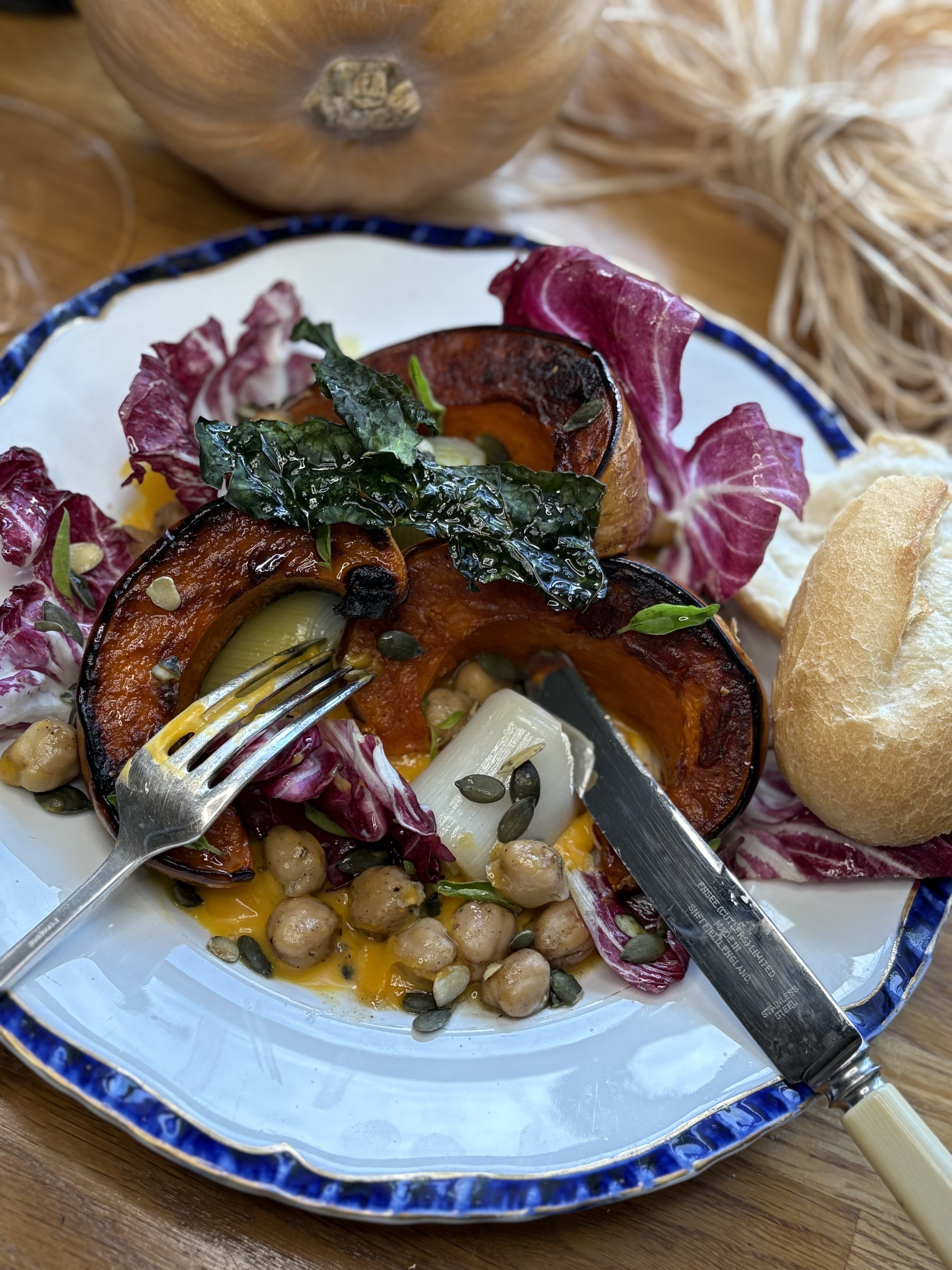 In all its autumnal, savoury yumminess this month’s recipe is a confit leek and warm pumpkin salad.