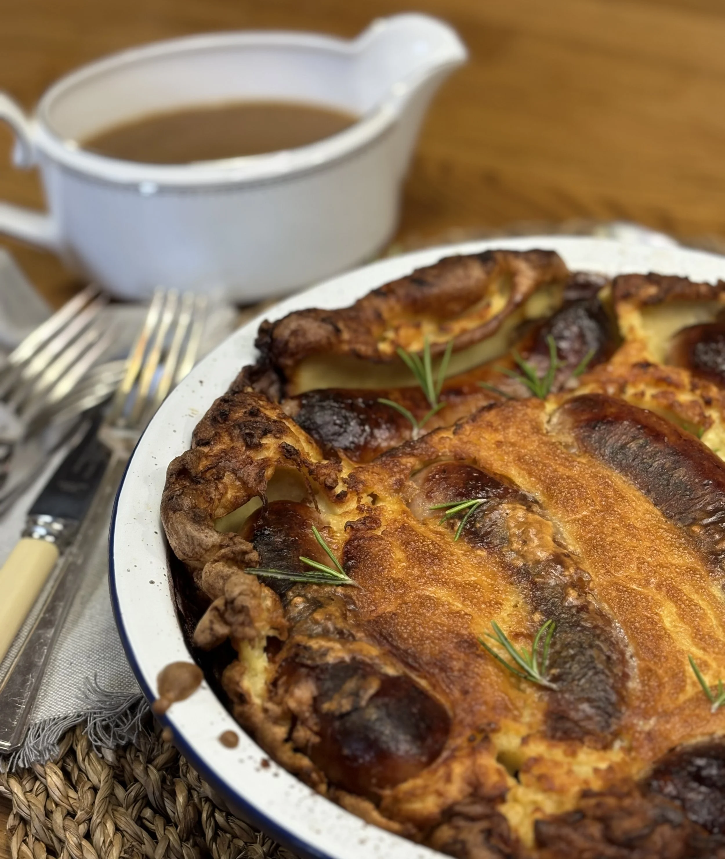 Lavish your toad in the hole with the thick sweet gravy and flight over who gets the first slice.